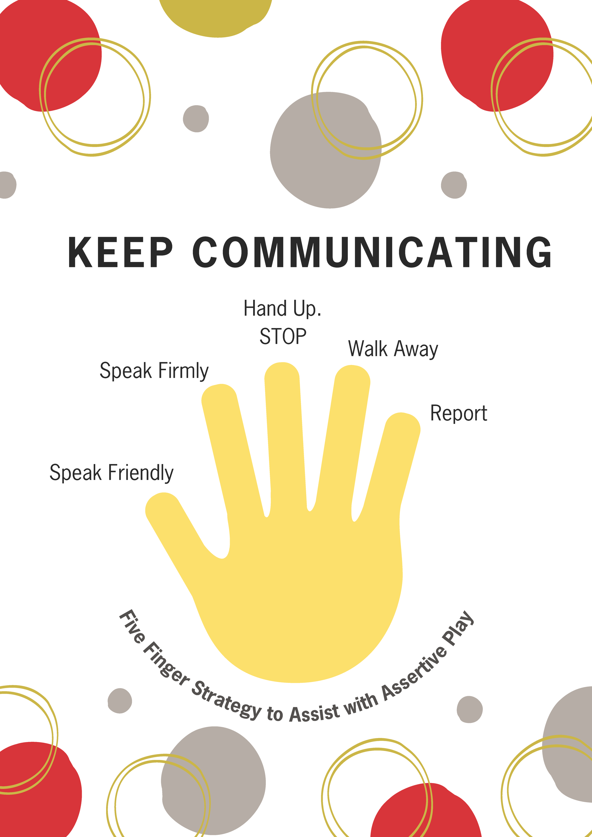 We regularly revisit the importance of using gentle hands and gentle words. Students are explicitly taught our Assertive Play strategy. First, speak in a friendly way. If needed, speak firmly. If the behaviour continues, walk away and report to a trusted adult.