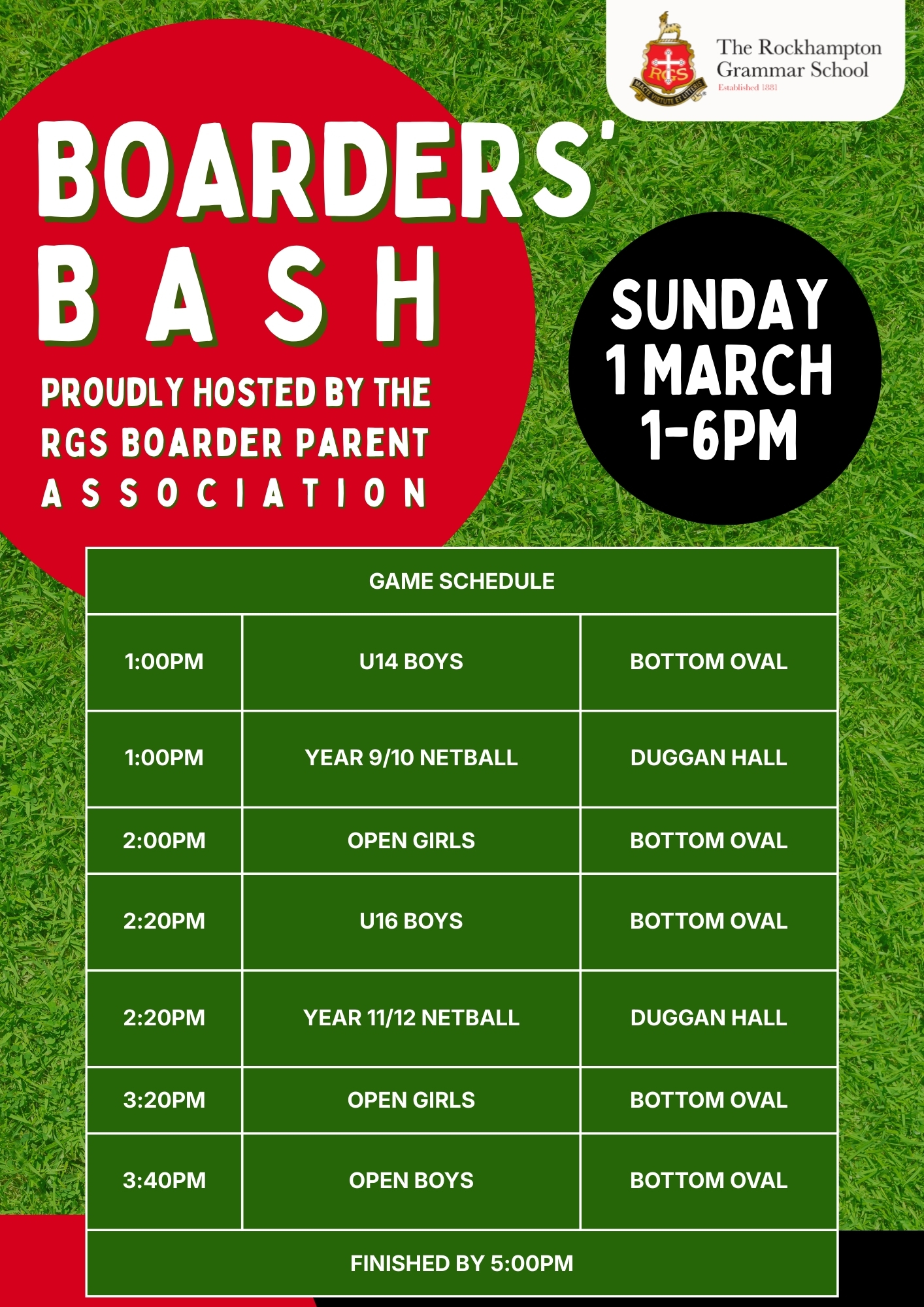 All RGS families are invited to the RGS Boarder Bash at RGS on Sunday, 1 March. Rugby union returns to the RGS Bottom Oval when RGS tackles Emerald's Marist College, while in Duggan Hall, RGS take on RGGS in netball.