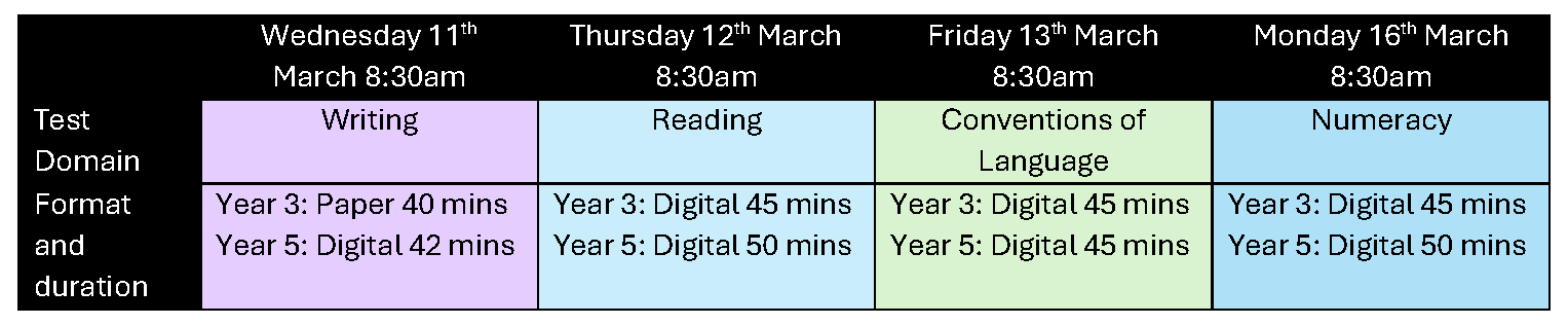 There are four tests for years 3 and 5 and they are completed in a set order. Below is the schedule for primary school tests.