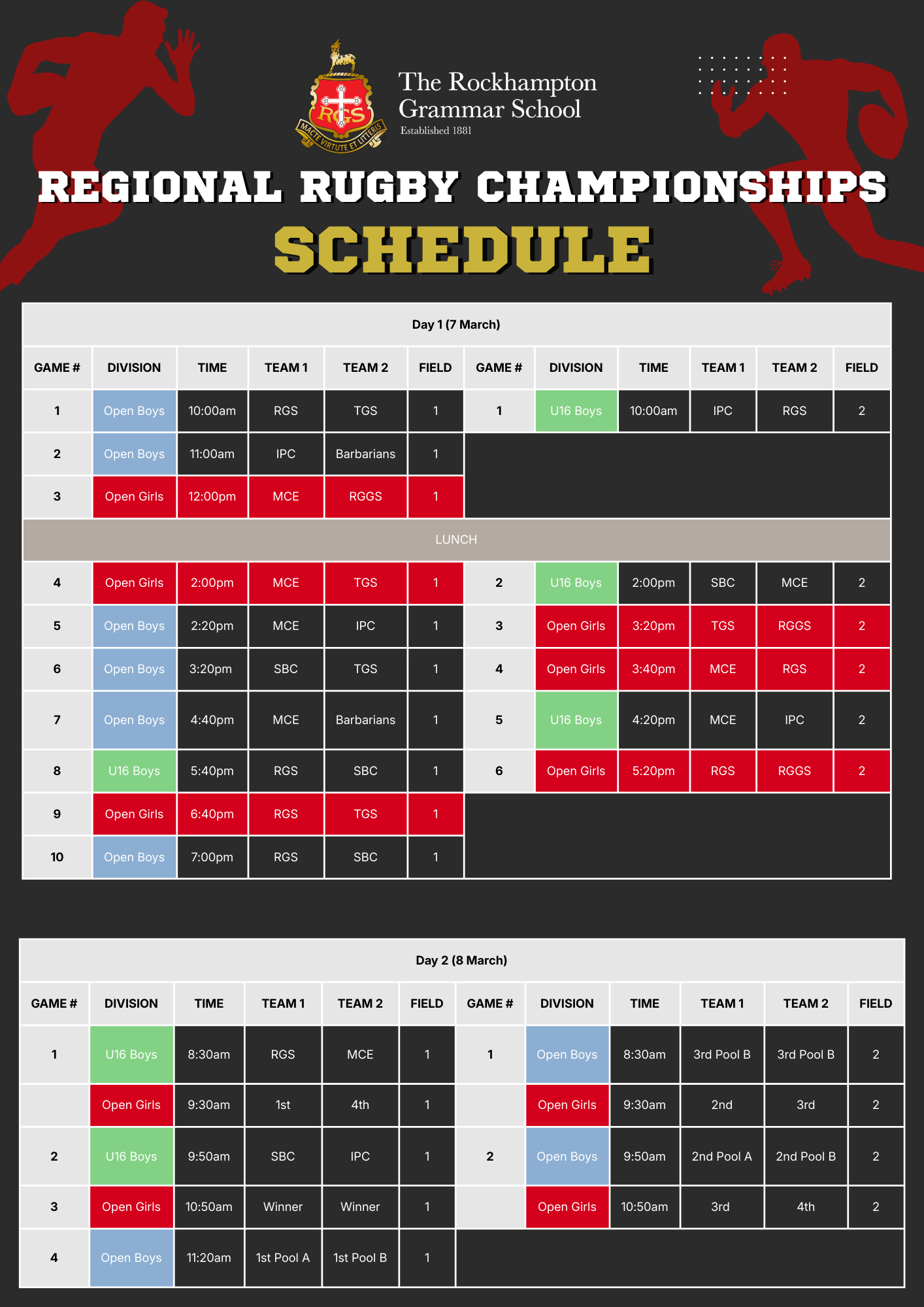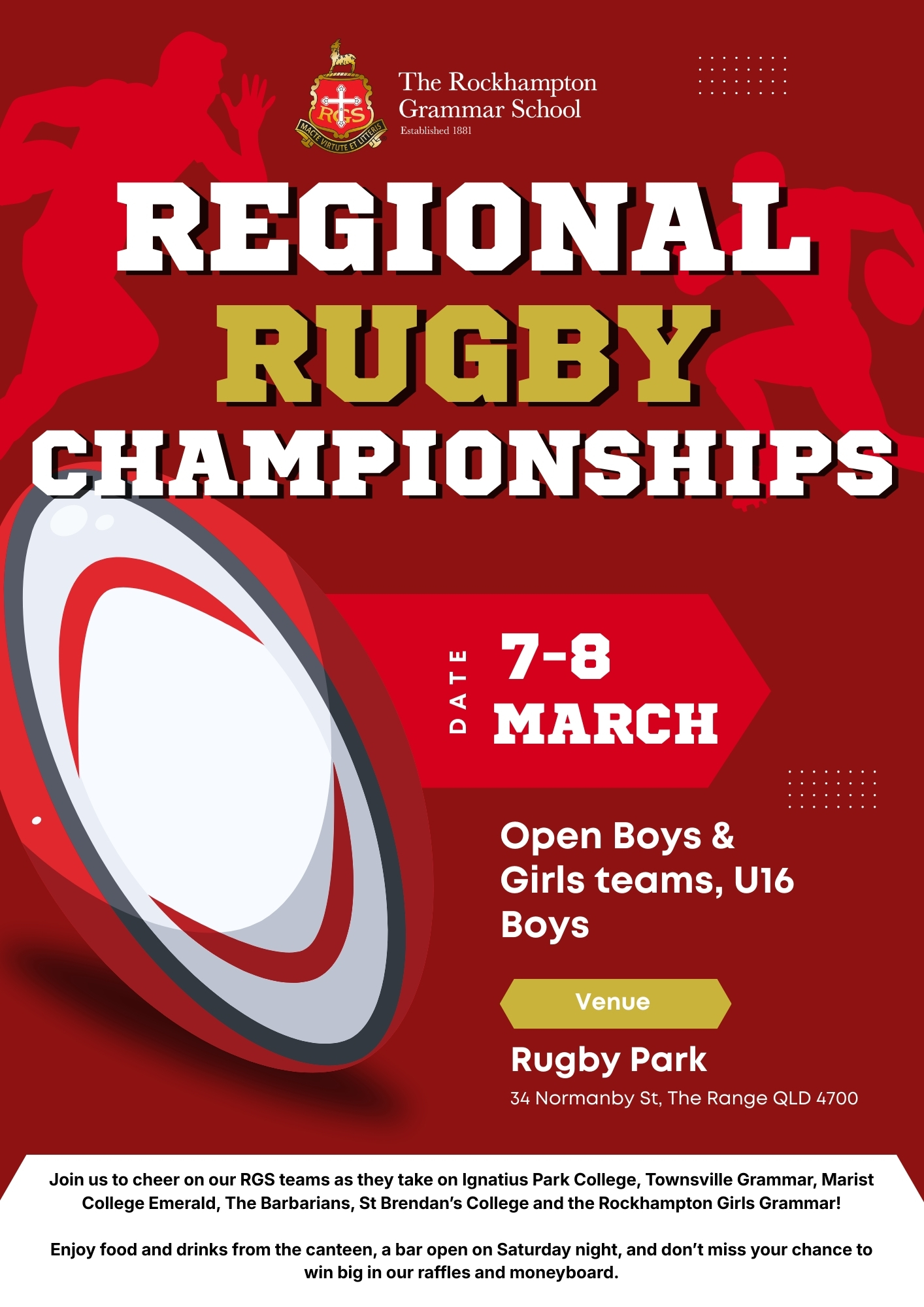 This weekend the School will host the 8th Annual Regional Rugby Championships in U16 and First XV Boys and Open Girls 7s. The competition will involve St Brendan’s College, Marist College Emerald, Townsville Grammar, Ignatius Park and Rockhampton Girls Grammar. Matches start at 10am on Saturday with the final game on Saturday night being between RGS and SBC First XV at 7pm. On the Sunday there will be finals across the Open Divisions with the Open girls at 10:50am and the Open Boys at 11:20pm. The RGS Rugby Club will be running a canteen throughout the weekend as well as raffles and the bar will be open in the main clubhouse Saturday evening.